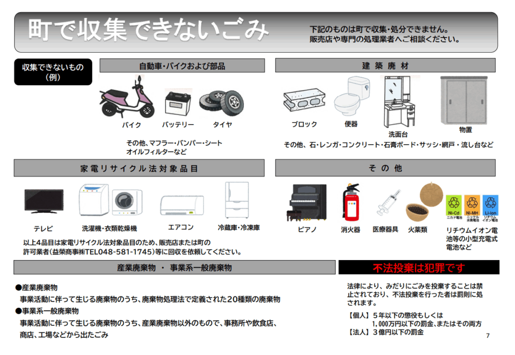 町で収集できないごみ ごみ 2025.09.182025.09.29 可燃ごみ 資源ごみ 不燃ごみ 可燃粗大ごみ 有害ごみ 町で収集できないごみ 可燃粗大ごみ・有害ごみ・指定場所一覧 可燃ごみと不燃ごみの持ち込み 不燃ごみの変更点 ごみの分別目安表 あ~か か~こ こ~す す~て て~ひ ひ~ま ま~わ 「ごみの出し方」へ戻る