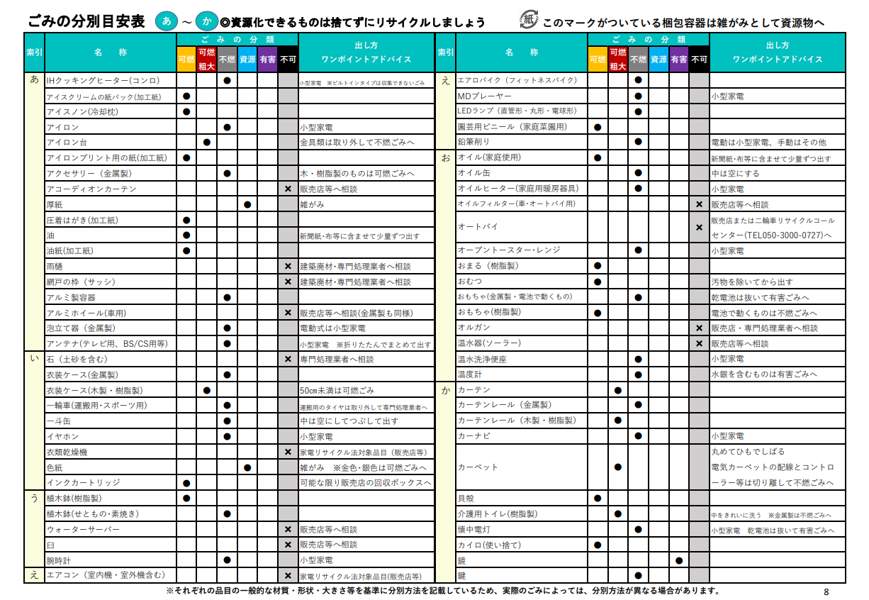 可燃ごみ 資源ごみ 不燃ごみ 可燃粗大ごみ 有害ごみ 町で収集できないごみ可燃粗大ごみ・有害ごみ・指定場所一覧 可燃ごみと不燃ごみの持ち込み 不燃ごみの変更点ごみの分別目安表あ~か か~こ こ~す す~て て~ひ ひ~ま ま~わ「ごみの出し...