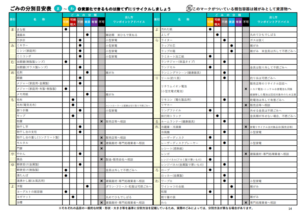 ごみの分別目安表(ま~わ) ごみ 2025.09.192025.09.29 可燃ごみ 資源ごみ 不燃ごみ 可燃粗大ごみ 有害ごみ 町で収集できないごみ 可燃粗大ごみ・有害ごみ・指定場所一覧 可燃ごみと不燃ごみの持ち込み 不燃ごみの変更点 ごみの分別目安表 あ~か か~こ こ~す す~て て~ひ ひ~ま ま~わ 「ごみの出し方」へ戻る