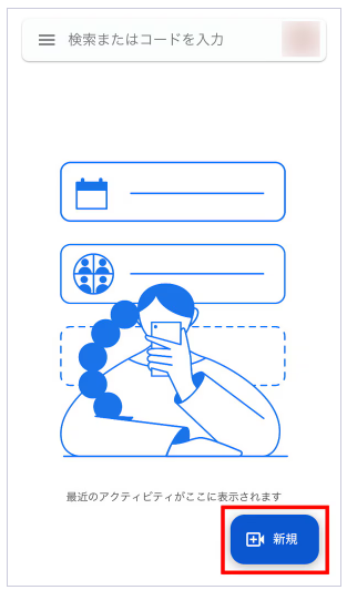 Google Meet公式アプリを起動し、「新規」をタップします。