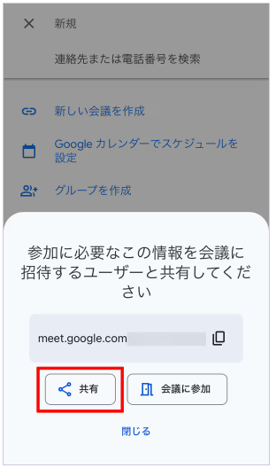 次に会議を主催する日程を選びます。今すぐ会議をはじめたい場合は「新しい会議を作成」、会議のスケジュールを決めたい場合は「Google カレンダーでスケジュールを作成」をタップしてください。ここでは「新しい会議を作成」をタップします。