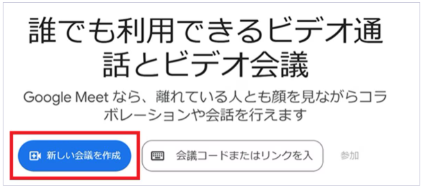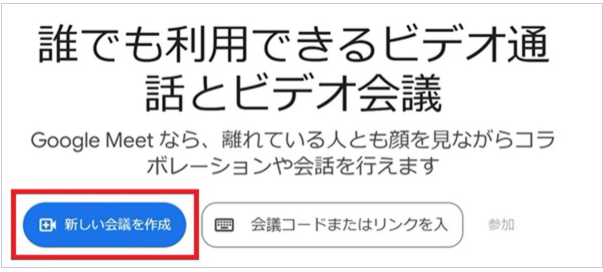 次に、Google MeetのWebサイトで「新しい会議を作成」をクリックします。
