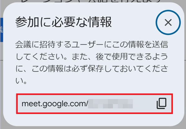 「参加に必要な情報」の画面からURLをコピーして、メールやチャットなどで参加者に配布してください。