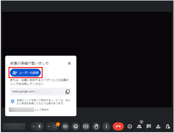 Google Meetの会議画面に遷移して以下のような画面が表示されたら、「ユーザーの追加」をクリックしてください。
