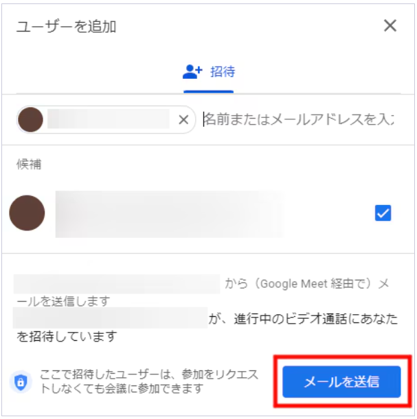 「ユーザーを追加」の画面では、招待したいユーザーの名前、またはメールアドレスを入力して参加者を検索できます。招待したい参加者にチェックを入れて、「メールを送信」をクリックすると、会議に参加できるURLがメールで送信されます。