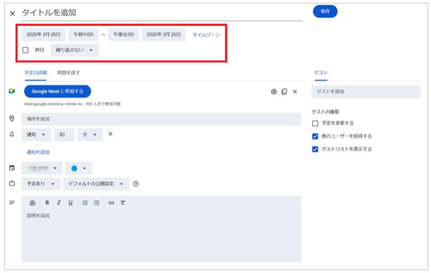 Googleカレンダーの画面に遷移するので、会議を行う日時を設定しましょう。