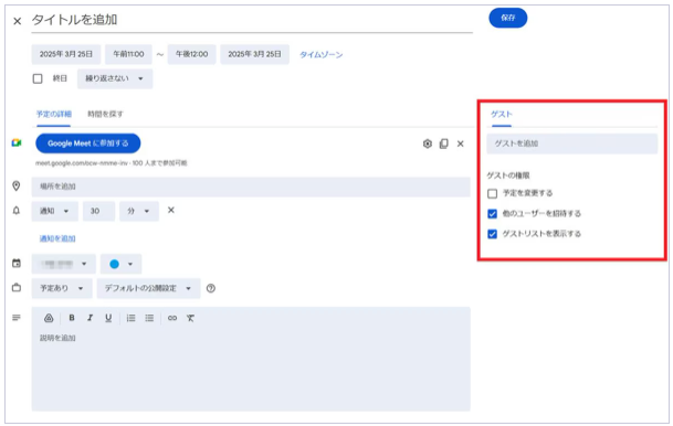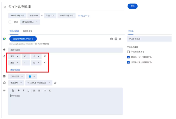 画面右上の「保存」をクリックすれば、通知設定は完了です。設定したタイミングになると、招待した相手にGoogle MeetのURLがメールで送信されます。
