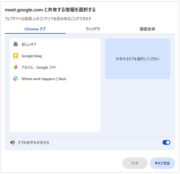現在開いているChromeタブ、ウィンドウから選択するか、画面全体を選択して共有が可能です。