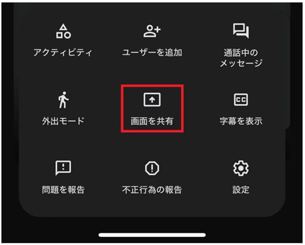 スマホでは、画面下部の「︙」からメニューを開いて「画面を共有」を選択し、画面の指示に従って操作すると、スマホの画面全体を共有できます。