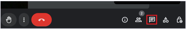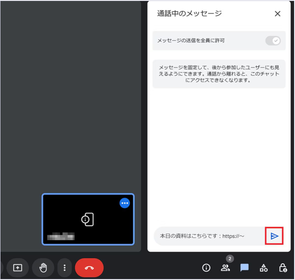 チャットアイコンを選択すると、「通話中のメッセージ」の機能が開きます。メッセージを入力して送信ボタンを選択すると、チャットにメッセージを送信できます。