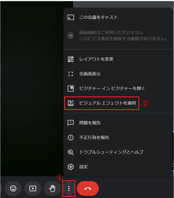 パソコンでは、「︙」>「ビジュアルエフェクトを適用」から背景の変更が可能です。