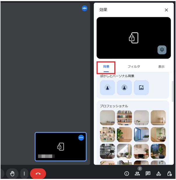 スマホの場合は、セルフビューの下部にある「エフェクト」のアイコンから操作して背景の変更が設定できます。