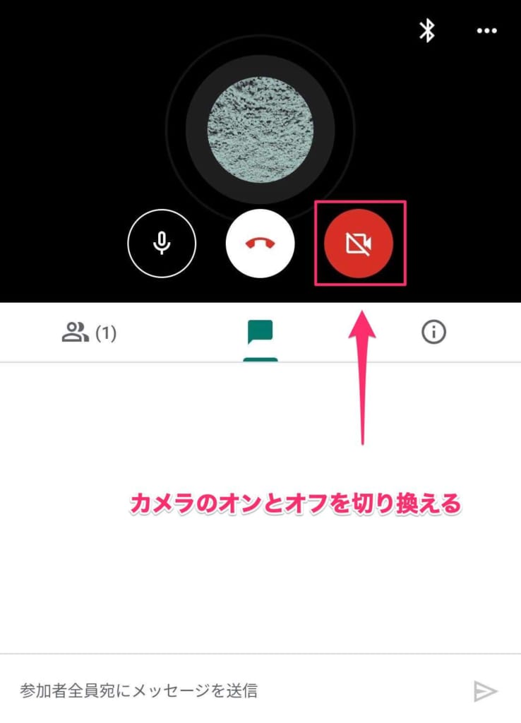 画面中央右のビデオマークをタップすると、カメラのオフ・オンが切り替え可能です。