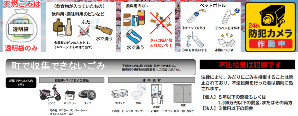 可燃ごみ 資源ごみ 不燃ごみ 可燃粗大ごみ 有害ごみ 町で収集できないごみ可燃粗大ごみ・有害ごみ・指定場所一覧 可燃ごみと不燃ごみの持ち込み 不燃ごみの変更点ごみの分別目安表あ~か か~こ こ~す す~て て~ひ ひ~ま ま~わ「ごみの出し...