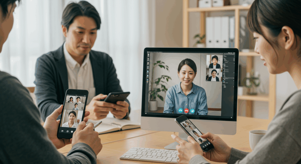TV会議を使えば、自宅のスマホ・PCで会議に参加(無料で100名、60分)参加できます。